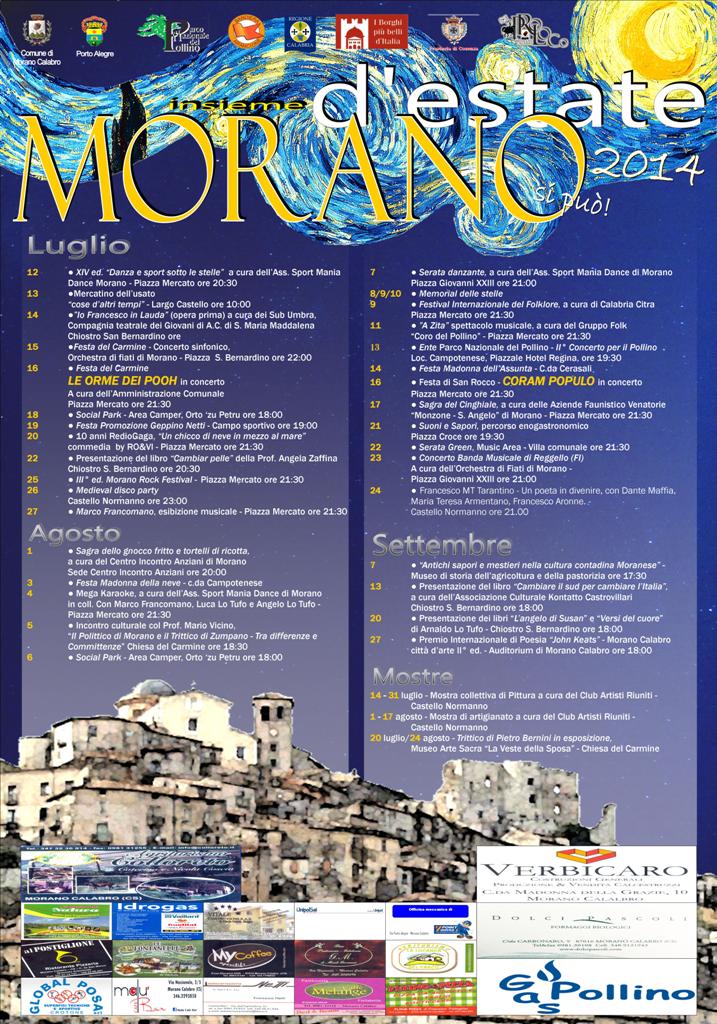 «Nonostante le ben note difficoltà finanziarie e il poco tempo a disposizione – ha affermato Emilia Zicari, assessore alla cultura del comune di Morano – siamo comunque riusciti a redigere il cartellone estivo. Gli avvenimenti cui abbiamo pensato, rispondono a nostro parere, alla duplice esigenza di soddisfare da un lato le aspettative di generazioni diverse, con un occhio di riguardo alla festa della Madonna del Carmine e alle esperienze aggregative del momento, dall’altra alla valorizzazione a scopo turistico di tutti i luoghi che caratterizzano Morano».