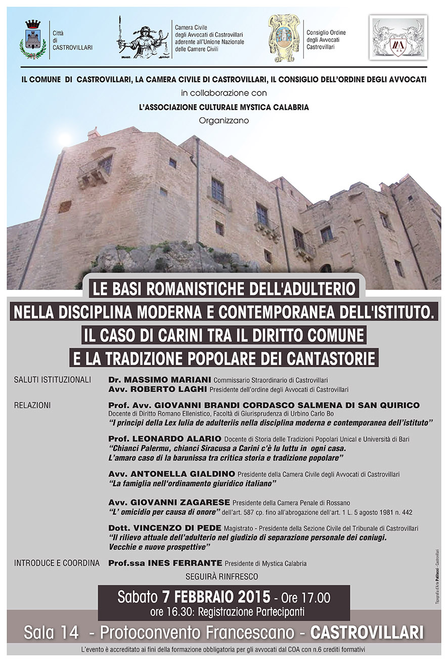 “Le basi romanistiche dell’adulterio nella disciplina moderna e contemporanea dell’Istituto. Il caso di Carini tra il diritto comune e la tradizione popolare dei cantastorie”. E’ questo il tema – tra giurisprudenza e antropologia – di un convegno che si terrà sabato (7 febbraio), nella sala 14 del Protoconvento Francescano di Castrovillari, organizzato dalla Camera Civile e dal Consiglio dell’Ordine degli Avvocati di Castrovillari, con il patrocinio del Comune e in collaborazione con l’associazione culturale Mystica Calabria.