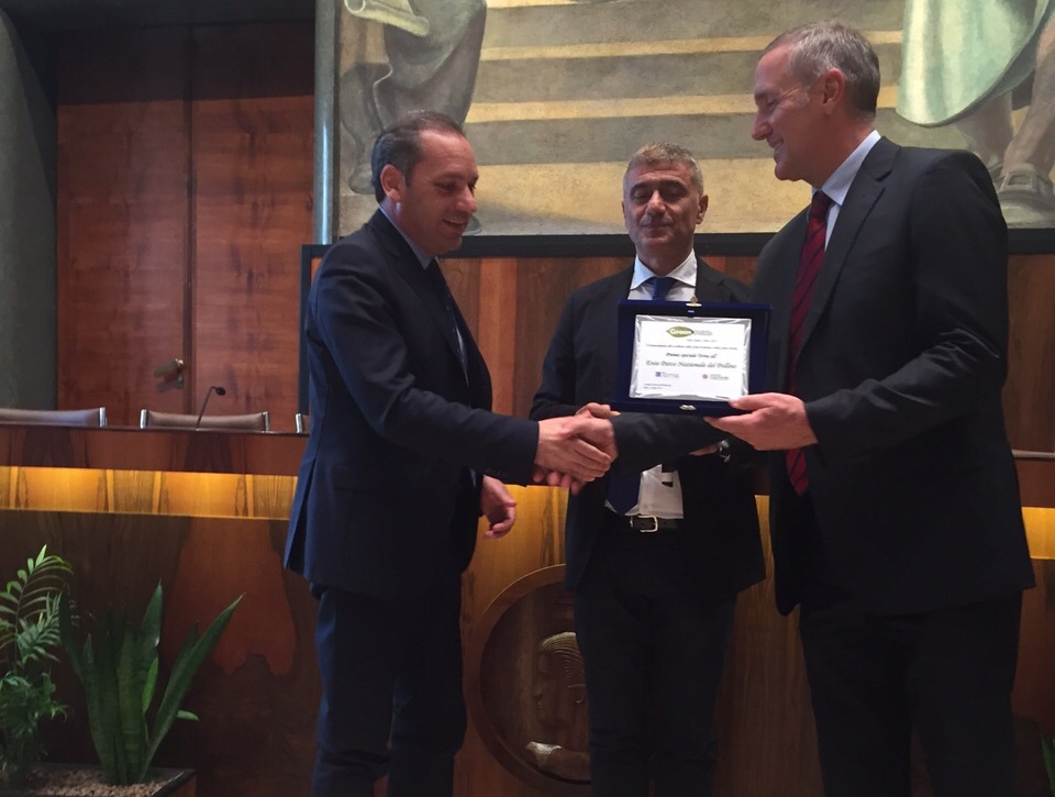 “Il Parco del Pollino ospita i due nodi elettrici più importanti del Sud: la Stazione di Laino (CS) e la Stazione di Rotonda (PZ), collegate con le dorsali 380 kV e 220 kV che trasportano l’energia prodotta in Calabria e Sicilia verso le regioni deficitarie del Centro e del nord d’Italia. Nella concertazione per il riassetto della rete nel Parco, l’Ente Parco ha assicurato sempre grande collaborazione, permettendo di individuare interventi di razionalizzazione (circa 100 km di linee verranno demoliti) che contribuiranno a ridurre il peso degli impianti Terna sul Parco stesso. Ha sottoscritto il Protocollo d’intesa per il riassetto della rete nel Parco nonché la convenzione per le compensazioni ambientali, che prevede la partecipazione alla realizzazione di importanti interventi di riqualificazione ambientale nelle aree naturali del Parco”. Con questa motivazione, l’Ente Parco Nazionale del Pollino è stato scelto dal Gruppo Terna, in collaborazione con la Fondazione UniVerde, come destinatario del riconoscimento Green Pride per le amministrazioni virtuose. A ritirare il premio, ieri (martedì 23 giugno), a Roma, il presidente del Parco, Domenico Pappaterra e il direttore dell’Ente, Gerardo Travaglio. Pappaterra ha ricevuto il Green Pride delle smart cities 2015 dalle mani del presidente della Fondazione UniVerde, Alfonso Pecoraro Scanio e da Pietro Vicentini, responsabile Autorizzazioni e Concertazione, Terna Rete Italia per il Centro-Sud (nella foto).