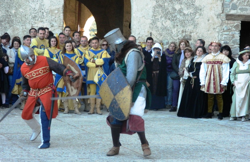 A metà mattinata, il fulcro dell’attenzione si è spostato nell’atrio del castello, dove gli sbandieratori di Bisignano hanno fatto da contorno ad alcuni duelli inscenati al limite della realtà dai “Cavalieri delle terre tarantine”. Il visitatore si è ritrovato catapultato nell’anno mille, circondato da figuranti vestiti e armati con dovizia di particolari. Una manifestazione di living history, “Aspettando Federico II”, messa a punto dall’associazione “Itineraria Bruttii” diretta da Paolo Gallo in collaborazione con l’Amministrazione comunale di Rocca Imperiale guidata dal sindaco Ferdinando Di Leo, con l’assessore alla Cultura della Regione Calabria Mario Caligiuri e con altri enti ed associazioni di settore, come la stessa “Antiquitas” di Rocca che nel primo pomeriggio ha accompagnato gli intervenuti in visita guidata al castello. E “Orizzonti Rosetani” di Roseto Capo Spulico che ha partecipato con diversi figuranti al corteo storico.