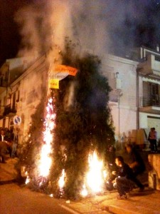 Nelle viuzze del centro storico poi, nel raggiungere gli altri falò, spazio ai tradizionali e antichissimi “puntilli”, barriere umane formate per lo più da giovani che bloccano il passaggio della gente sin quando chi sopraggiunge non riesce a farsi largo per poter così aver accesso al falò. Anche in questo caso un ruolo importante lo gioca la banda che accompagna tutti questi rituali.