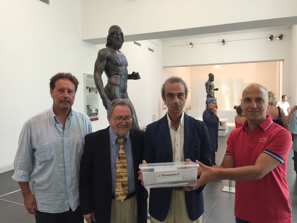Le firme, a rappresentanza di una diffusa volontà popolare, sono state consegnate al delegato del Ministro dei Beni Culturali, Dottor Salvatore Patamia, segretario regionale dei Beni Culturali e responsabile pro-tempore del Museo di Reggio, in un Museo letteralmente invaso dai visitatori. La consegna dei risultati della petizione su Firmiamo.it ha rappresentato un utile momento di dialogo tra i promotori dell’iniziativa Francesco Alì e Pasquale Amato (Comitato Bronzi – Museo Reggio Calabria) e il Ministero per i Beni e le Attività Culturali, al fine di consolidare una volta per tutte l’inamovibilità dei bronzi di Riace.