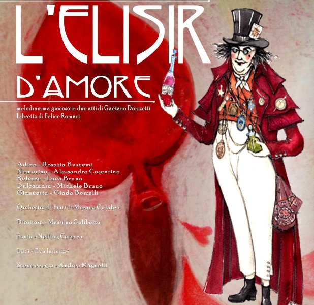 Rosaria Buscemi (soprano-Adina), Alessandro D’Acrissa (tenore-Nemorino), Luca Bruno (baritono-Belcore), Michele Bruno (basso-Dulcamara) e Giada Borrelli (soprano-Giannetta) sono i cinque protagonisti, cantanti di indiscutibile talento, ognuno dei quali vanta collaborazioni con importanti enti teatrali e attività concertistica sul territorio nazionale e non. Con loro sulla scena si muoveranno numerose comparse in costume e, per seguirla meglio, l’opera sarà sopratitolata integralmente. Scene e regia sono a cura di Andrea Magnelli, la fonia è affidata a Nellino Cosenza mentre le luci sono di Eva Iannuzzi.