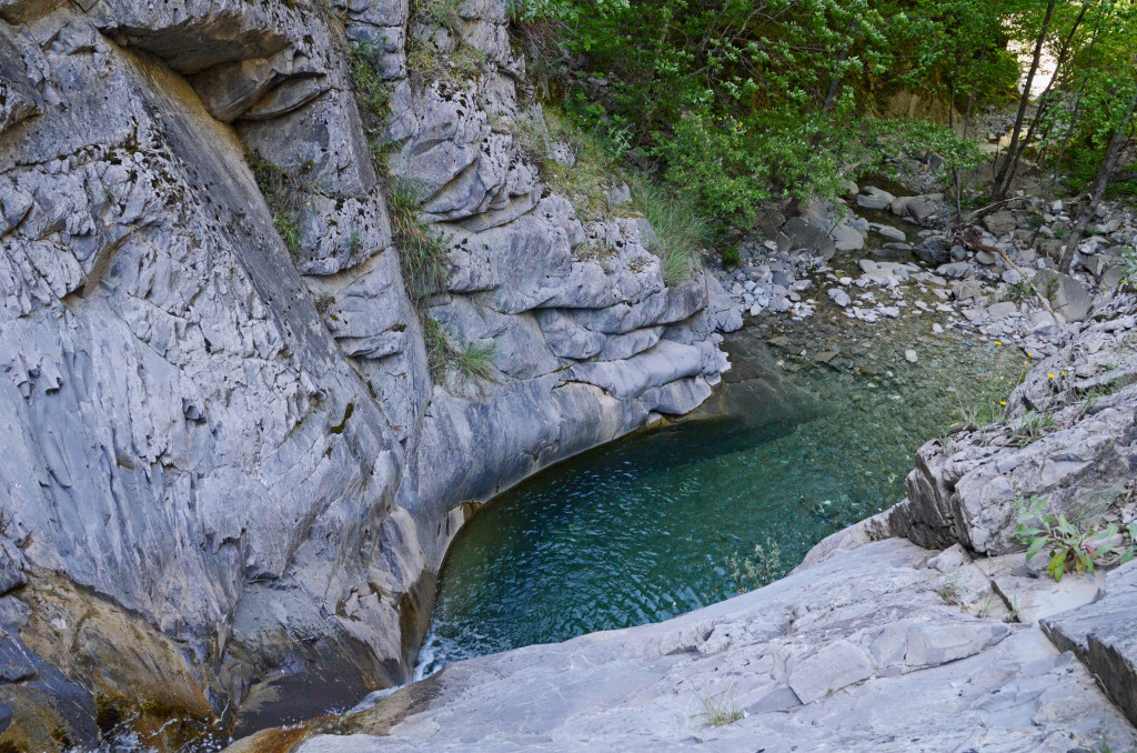 Il 20 aprile (Peppe, Pino e il giovane Michele) siamo partiti verso la contrada “Gioro”, abbiamo raggiunto la piccola sellata tra il sito archeologico della “Cappella di S.Giorgio” e il “Timpone Strazzacappa” e ci siamo inoltrati nella fitta boscaglia di leccio che guarda verso Alessandria del Carretto e che porta al “Canale del forno”. Con accetta e cesoia abbiamo eliminato i rovi e i rami che hanno occluso nuovamente il sentiero, ma dopo mezz’ora abbiamo sentito lo scroscio dell’acqua che scorre lungo lo stretto “Canale del forno” e abbiamo rivisto la famosa Cascata “d’a Vucca’i summa”! E’ ancora piena d’acqua limpida, che nasce sotto la “timpa” della “Garoccella”. Michele è rimasto incantato davanti a quello spettacolo di stupenda bellezza.