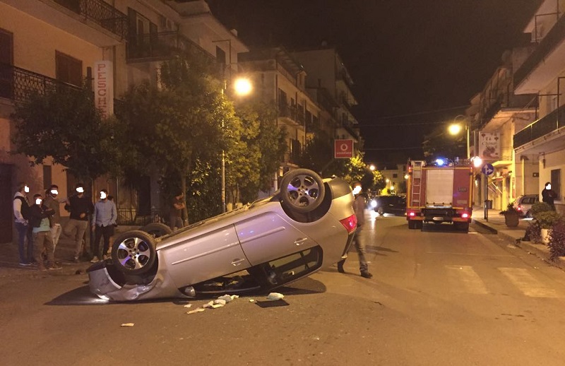 Impatta violentemente contro un’auto in sosta e, dopo una serie di zig-zag sulla carreggiata, si ribalta rimanendo con le ruote in aria. E’ la dinamica di un fragoroso incidente stradale, per fortuna senza gravi conseguenze, verificatosi nel cuore della notte tra domenica e lunedì sulla centralissima via Lutri di Trebisacce. Protagonista dello spettacolare incidente il giovane G. A., 36 anni, di Albidona, alla guida di una Volkswagen Golf (nella foto) che, per cause al vaglio dei Carabinieri della Stazione di Trebisacce, dopo aver urtato violentemente contro un’auto parcheggiata davanti a un noto negozio di telefonia, ha fatto una serie di zigzag sull’asfalto e si è capottata rimanendo sulla carreggiata con le ruote in aria e il tettuccio accartocciato.