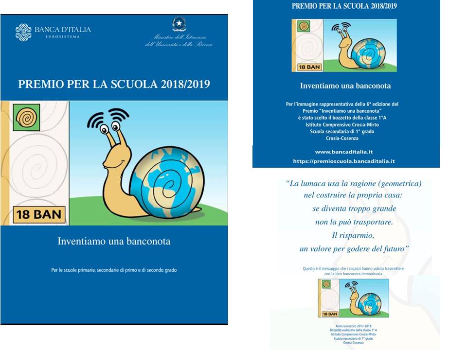«Ho il piacere di informarla – si legge testualmente nel documento trasmesso alla dirigente Donnici – che il bozzetto è stato ora scelto come logo della sesta edizione del Premio, il cui tema è “Il denaro e le emozioni”. L’ideazione grafica (nella foto) sviluppata dai ragazzi della classe 1°A dello scorso anno e il messaggio che hanno voluto trasmettere con la loro realizzazione sono risultati i più idonei a rappresentare il tema di quest’anno, che vuole richiamare l’attenzione sull’importanza di una gestione ragionata del denaro». I ragazzi, lo scorso anno, sulla loro banconota immaginaria hanno posto una lumaca, con un messaggio specifico: “La lumaca usa la ragione (geometrica) nel costruire la propria casa: se diventa troppo grande non la può trasportare. Il risparmio, un valore per godere del futuro”. Il bozzetto dei ragazzi di Crosia, ora verrà diffuso, dalla Banca d’Italia, in tutta la nazione, allo scopo di promuovere la nuova edizione del Premio. Oltre alla rappresentazione grafica verrà inserita la frase scelta dagli stessi allievi e verrà evidenziato che il suddetto bozzetto è stato realizzato nell’anno scolastico 2017/2018 dalla 1^ A dell’Istituto Comprensivo Crosia (Cosenza).