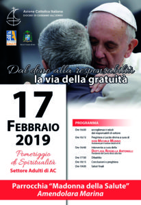 Pomeriggio di spiritualità proposto dal Settore Adulti di Azione Cattolica nella parrocchia “Madonna della Salute” di Amendolara Marina, domenica 17 febbraio, a partire dalle 16, sul tema “Dal dono alla responsabilità la via della gratuità. Partendo dal messaggio di Papa Francesco per la XXVII Giornata mondiale del malato, «Gratuitamente avete ricevuto, gratuitamente date» (Mt 10,8), il settore invita a riflettere sulla responsabilità del dono che percorre la strada della gratuità.