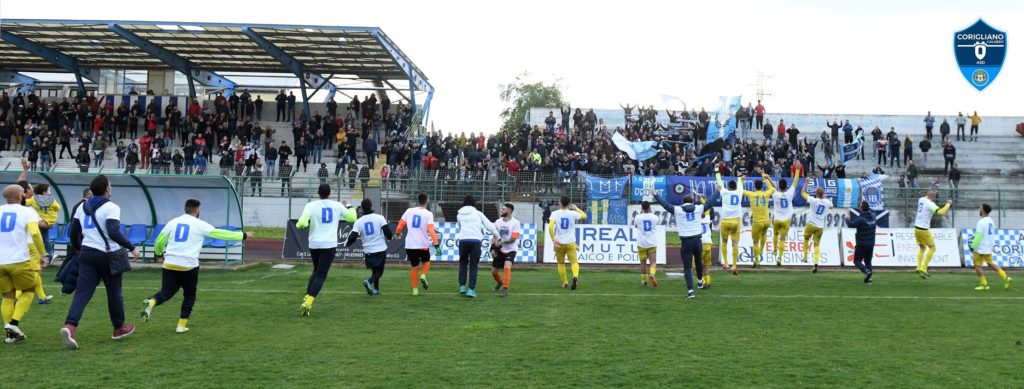 Eccellenza, 29^ giornata: Il Trebisacce rovina addosso al Siderno e conquista la matematica salvezza. In riva allo Jonio i giallorossi dilagano per 6-0 contro l’ultima in classifica già retrocessa. Tripletta di Gueye, e poi Naglieri. Miniaci e De Paola. Il Corigliano già vincitore del campionato si toglie la soddisfazione, davanti al proprio pubblico in festa (nella foto) anche di battere la seconda della classe, ReggioMediterranea, per 4-2, che ora dovrà difendersi dall’Olympic Rossanese (4-0 all’Acri).