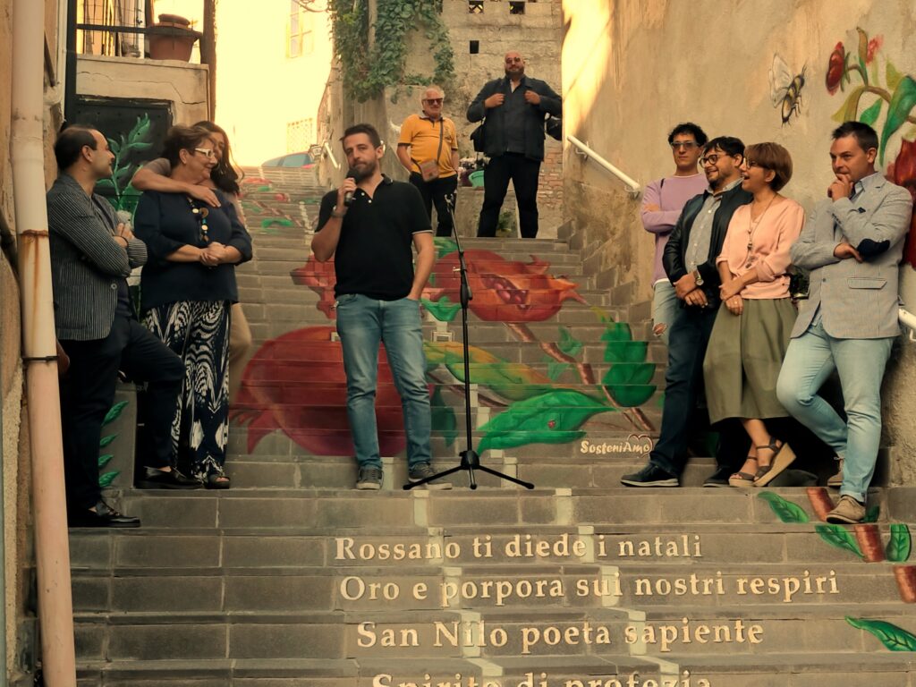 di Antonio Le Fosse – Tanta partecipazione alla cerimonia d’inaugurazione dell’abbellimento della scalinata artistica di Piazza Grottaferrata, nel cuore del centro storico bizantino (area di Rossano), a cura dell’Associazione “Sosteniamo Corigliano-Rossano”. All’evento, dopo la benedizione, da parte di don Pietro Madeo (Parroco della Cattedrale di Rossano), hanno preso parte il sindaco Flavio Stasi, oltre ad alcuni consiglieri ed assessori comunali (Alessia Alboresi, Costantino Argentino, Tatiana Novello e Mauro Mitidieri), numerosi cittadini e rappresentanti di diverse Associazioni del territorio. Presenti, tra l’altro, gli ex sindaci di Rossano: Tonino Caracciolo e Franco Filareto, ma anche il Presidente della Pro Loco Federico Smurra e il Presidente della FITA Cosenza Antonio Maria D’Amico. In serata, dopo la presentazione dei lavori a cura di Graziella Colamaria (Presidente dell’Associazione Sosteniamo Co-Ro), si sono vissuti momenti di spettacolo ricreativo con lo spettacolo di burattini dal titolo “Jogale e il vento” a cura dell’Associazione “Il Sasso nello Stagno”, laboratori per bambini ed anche la degustazione gratuita dei tradizionali “scoratedd”. Molto bella la poesia scritta dalla poetessa Anna Lauria, la quale è stata inserita nella scalinata, dedicata a San Nilo (Santo Patrono do Rossano). Queste le parole: “Rossano ti diede i natali, oro e porpora sui nostri respiri, San Nilo poeta e sapiente, spirito di profezia, asceta in cammino perenne, nobile arco luminoso fra Oriente ed Occidente”.