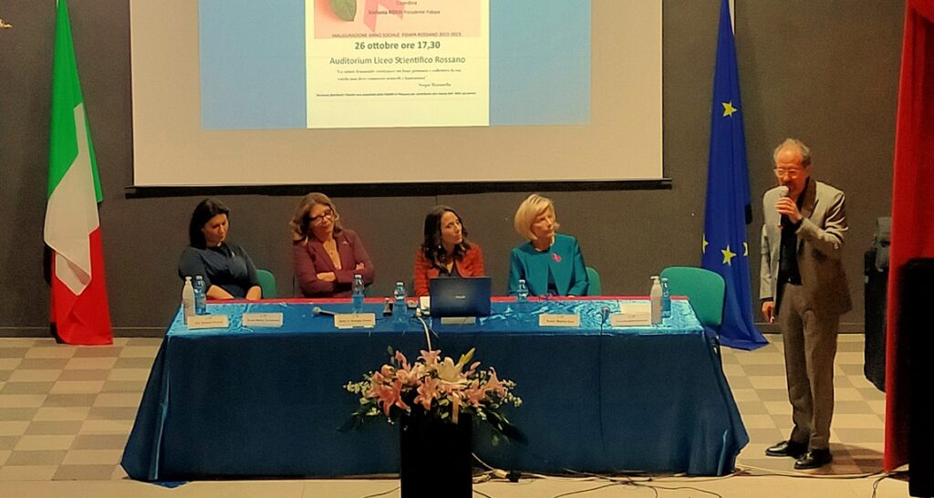 di Antonio Le Fosse – Iniziativa della F.I.D.A.P.A. (Federazione Italiana Donne Arti Professioni e Affari) di Rossano, in occasione della settimana rosa, che avuto luogo presso l’Auditorium del Liceo Scientifico. Nella serata di mercoledì 26 ottobre 2022, dopo l’inno nazionale ed i saluti del Dirigente Scolastico Antonio Franco Pistoia, si è dato vita ai lavori del convegno. Tema dell’incontro: “Un viaggio per la prevenzione e cura del tumore al seno”. All’incontro-dibattitto, coordinato dalla prof.ssa Stefania Rossi (Presidente della FIDAPA), hanno preso parte il dott. Pietro Giorgio Costa (Medico Chirurgo Senologo) il quale si è soffermato su prevenzione e diagnosi precoce dei tumori alla mammella attraverso l’utilizzo di alcune slide proiettate su un maxi-schermo con alcuni dati statistici; la dott.ssa Marina Susi (Medico Oncologo) che ha parlato di prevenzione che è la migliore amica di ogni donna; la dott.ssa Maria Sommario (Chirurgo Plastico Ricostruttivo) che ha incentrato la sua relazione sulla ricostruzione mammaria post-oncologica; la Dott.ssa Pasqualina Sprovieri (Nutrizionista) che ha parlato di nutrizione e sistema immunitario. L’incontro ha voluto puntare i riflettori su una malattia che, nel 2021, ha visto colpite 55 mila donne. «Di questo problema non se ne parla mai abbastanza – ha dichiarato la Presidente della Fidapa di Rossano – così abbiamo deciso di organizzare questo appuntamento con gli specialisti del settore. Sensibilizzare e far conoscere il problema sono i primi passi per vincere una battaglia che riguarda tutte noi». Contro il cancro al seno, come del resto per molti tumori, l’arma più efficace è il tempo e la prevenzione. La salute passa principalmente dalla prevenzione, in tal senso visite e screening sono il primo passo per sconfiggere questo male. Al centro del dibattito è stata posta anche l’alimentazione.