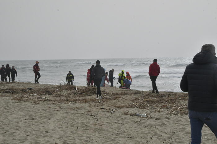Personale del 118 e della Croce rossa presta soccorso ai superstiti del peschereccio che si è spezzato in due, a "Steccato" di Cutro, nel Crotonese, 26 febbraio 2023. I circa cinquanta superstiti trovati sulla spiaggia hanno raccontato ai soccorritori, infatti, che sul peschereccio su cui viaggiavano, che si è spezzato in due a causa del mare molto mosso, erano almeno in 250. ANSA/GIUSEPPE PIPITA