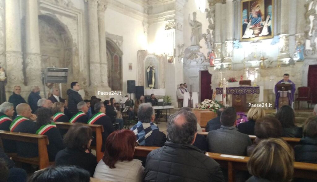 di Vincenzo La Camera – Non c’è stata una famiglia di Amendolara che non aveva almeno un rappresentante per l’ultimo saluto al sindaco Pasquale Aprile. In aggiunta alle tante persone giunte dai paesi limitrofi. Un giornata di lutto cittadino vissuta con commozione e mestizia in tutto il paese, culminata con la camera ardente e poi il corteo funebre verso la chiesa del Convento di San Domenico dove dalle ore 16 alle 17.45 circa si sono tenuti i funerali. Già alla camera ardente, allestita dalle ore 13.30 in Sala Consiliare, (foto sotto) il via vai di gente è stato continuo, con tante persone che hanno sostato davanti al feretro del sindaco circondato dai familiari. Il feretro – con la foto del primo cittadino e la fascia tricolore adagiate sopra – ha rappresentato, nella sua drammaticità, un momento storico per il paese che purtroppo ha assistito alla dipartita del suo sindaco nel pieno delle sue funzioni. Pasquale Aprile, 74 anni, ha voluto onorare il voto popolare sino all’ultimo istante della sua vita, recandosi in Comune con la malattia che ormai avanzava e fino a quando le ultime forze glielo hanno consentito. Quel Comune che è stata la sua seconda casa: quarantadue anni da funzionario dell’ufficio Anagrafe, dieci da vicesindaco ed un anno e mezzo da primo cittadino. Alle 16 il feretro è giunto presso la chiesa del Convento nel rione Timpone dove è stato accolto all’ingresso dal parroco don Vincenzo Santalucia che ha concelebrato assieme ai confratelli don Nicola Arcuri, don Antonio Cavallo, don Franco Gimigliano, don Nicola Mobilio, don Luca Pitrelli, don Nicola Vilotta e il diacono don Vincenzo Gentile. I sindaci dell’Alto Jonio con la fascia tricolore hanno preceduto il feretro che è entrato in chiesa assieme ai familiari e a seguire l’Amministrazione Comunale di Amendolara e le forze dell’ordine con carabinieri, guardia di finanza, guardia costiera. In testa la Polizia Municipale con il vessillo del Comune di Amendolara, la bandiera italiana e quella europea.