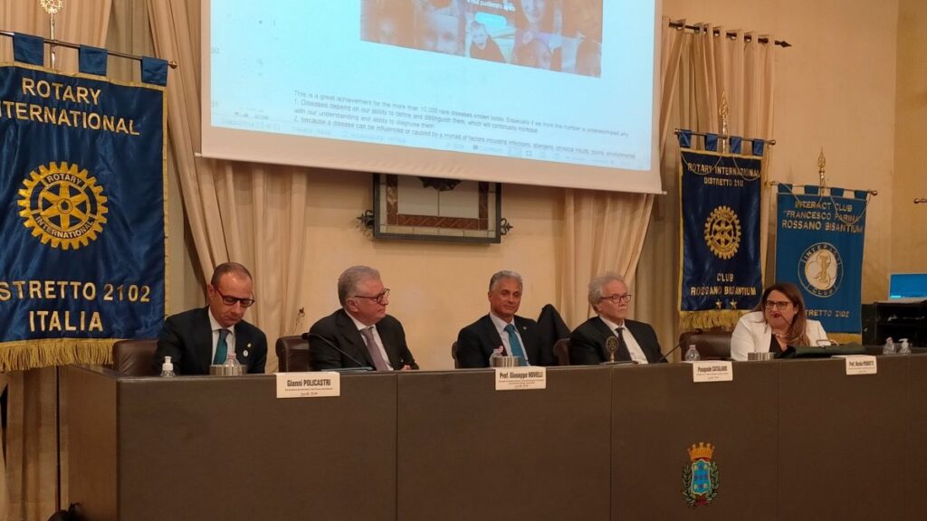 di Antonio Le Fosse – Si è tenuto sabato 26 marzo, nella Sala Rossa di Palazzo San Bernardino a Rossano,un convegno organizzato dal Rotary Club “Rossano-Bisantium” con il patrocinio del Distretto 2102 e altri club dell’Alto Jonio cosentino, dal titolo: “La medicina genomica nella diagnosi e cura delle malattie dell’uomo”, con dissertazioni del prof. Giuseppe Novelli (già Rettore all’Università “Tor Vergata” di Roma e Ordinario di Genetica Medica nella stessa e Università del Nevada) e del prof. Nicola Perrotti (Ordinario di Genetica Medica presso l’Università “Magna Graecia” di Catanzaro). Dopo i saluti istituzionali del presidente, avv. Pasquale Catalano, e le presentazioni dei relatori da parte della dott.ssa Bambina Russo (socia Rotary Club “Rossano-Bisantium” e Pediatra Specialista in Genetica Medica) e del dott. Rosario Aloe (socio fondatore past-president del club), la trattazione dell’argomento, moderata dalla giornalista Anna Russo, è stata avviata dal prof. Nicola Perrotti, il quale attraverso un’analitica relazione ha evidenziato l’importanza del test genetico NGS nei pazienti con tumore della mammella, discorrendo sull’esperienza maturata nello studio sui geni e relative modifiche di essi. Lo studioso, poi, ha sottolineato che i test genetici, che si possono eseguire in centri di eccellenza calabresi, a Catanzaro, presso l’ospedale universitario “Magna Graecia”, a Reggio Calabria, sono uno strumento molto valido per verificare la presenza di alcune alterazioni genetiche, che potrebbero esporre ad un maggior rischio di ammalarsi e di avvalersi di tali studi avanzati per poter approcciare un’adeguata cura. Egli, altresì, si è concentrato sull’importanza dello screening neonatale utile per comprendere possibili malattie in età infantile.