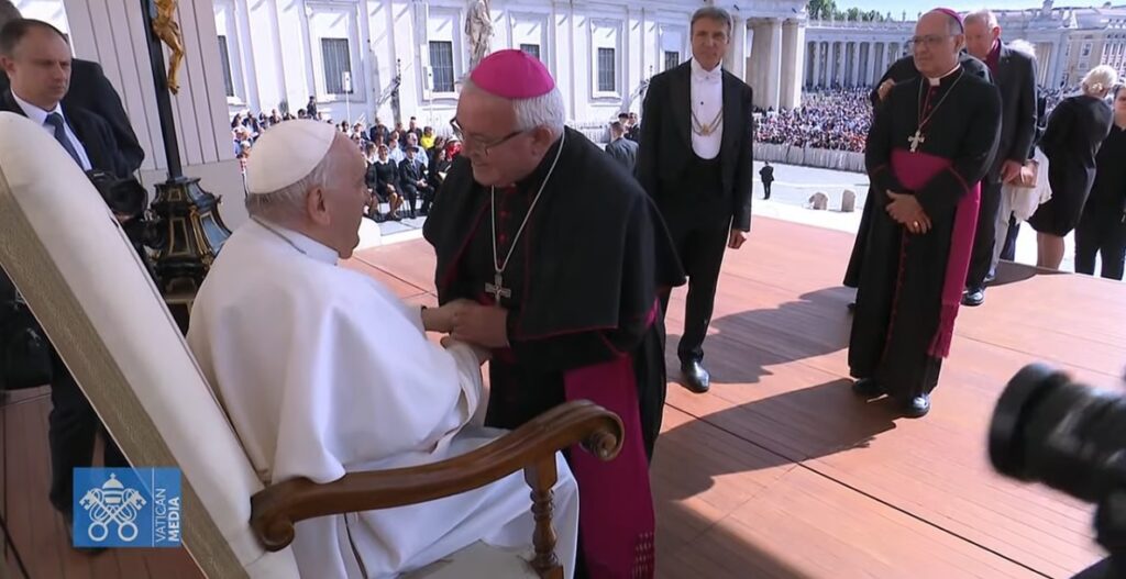Questa mattina tutti in Piazza San Pietro per l’Udienza del Santo Padre – appena rientrato dal viaggio apostolico in Ungheria – con i “fratelli” che hanno accompagnato la Madonna del Pollino circondati dall’affetto della propria comunità e di numerosi compaesani che vivono a Roma. Nel corso dell’Udienza, Papa Francesco ha ringraziato e benedetto tutti i pellegrini presenti, compresi quelli di San Severino Lucano, alle ore 9.53, per la precisione, poco prima di terminare la sacra adunanza. Il vescovo don Vincenzo Orofino ha salutato il Santo Padre (nella foto copertina) in rappresentanza di tutta la comunità di San Severino Lucano. Nel pomeriggio è previsto il rientro in Basilicata.