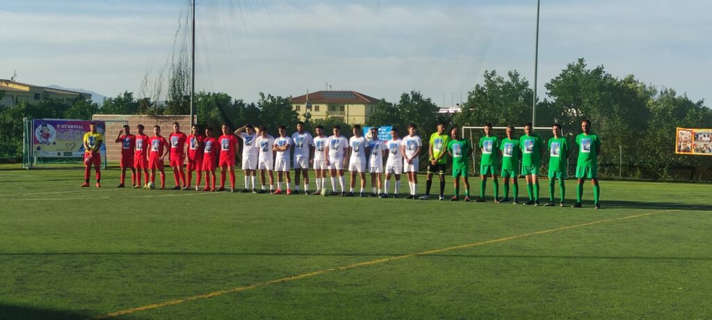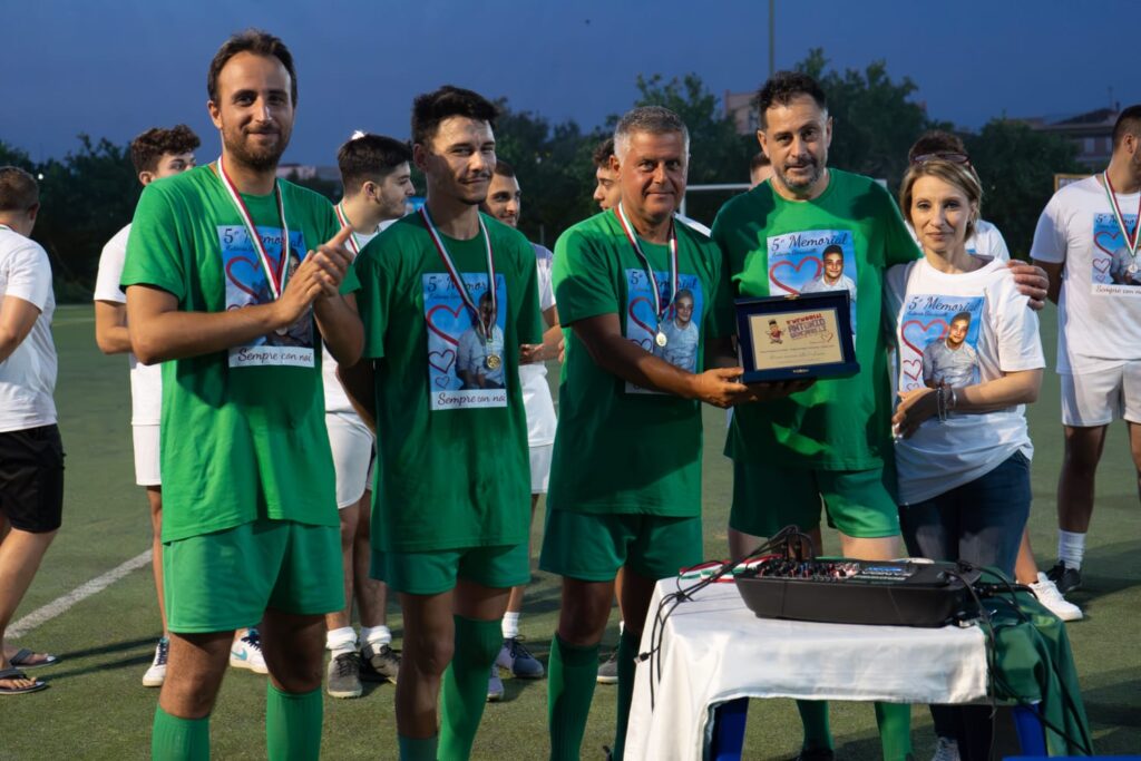 Quindi spazio al triangolare di calcio a 5 dove si sono affrontate il Team Friends Antonio, formato da compagni di scuola di Antonio Gencarelli e ex alunni della scuola superiore “Nicholas Green- Falcone Borsellino”, il Team Friends Giovanni, assemblata da amici del fratello di Antonio, e il Team Coop composto da colleghi di lavoro del papà. A margine del triangolare, per la cronaca, premiata come vincitrice con tanto di targa ricordo la squadra Coop mentre tutti i partecipanti sono stati omaggiati con maglia commemorativa e medaglia. Maglia celebrativa donata anche al presidente dello Sporting Club Massimo Fino per la disponibilità nell’ospitare cordialmente la manifestazione. A margine anche i ringraziamenti affettuosi di Mamma Chiara (in foto copertina con papà Domenico, ultimi due a destra) a tutti i partecipanti e a chi ha permesso la realizzazione dell’evento nonché un rinfresco offerto dalla famiglia.