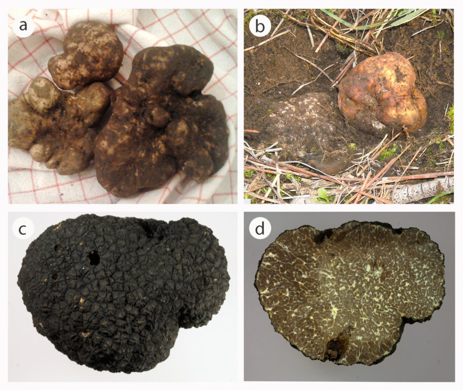 a) Tartufo bianco pregiato ( magnatum) (foto di Salvatore Argentano); b) Tartufo bianchetto (T. borchii) ancora parzialmente posizionato nel sito di ritrovamento (foto di Luigi Gallo); c) Tartufo uncinato (T. aestivum f. uncinatum) particolare del peridio di colore nero con verruche piramidali (foto di Andrea Rubini); d) Tartufo uncinato, sezione di tartufo maturo con la caratteristica gleba di colore nocciola e venature bianche, (foto di Andrea Rubini).