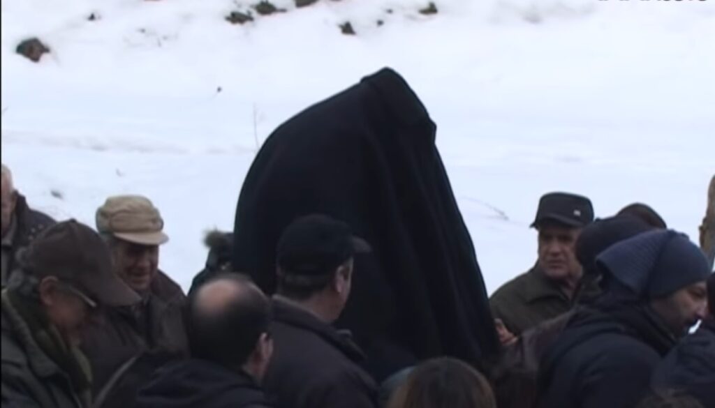 Ogni paese festeggia con tradizioni e maschere diverse. Qui ci occuperemo di “U n’caudarott” di San Lorenzo Bellizzi – sul Pollino ai confini con la Lucania – grazie anche a quanto ci ha raccontato Lorenzo Gugliotti, appassionato di storia locale (nell’immagine qui sotto un suo dipinto). L’ etimologia del nome è incerta, ma colpisce la vicinanza semantica e figurativa con “u cuadaròtte” di Gallicchio (Potenza), il cui dizionario dialettale informa essere il calderotto per produrre piccole forme di formaggio. Stesso risultato offre il “Nuovo dizionario Siciliano-Italiano” del 1838 di Vincenzo Mortillaro.