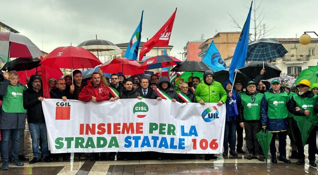 di Antonio Le Fosse – Numerosi cittadini, nonostante la pioggia, al sit-in, promosso da CGIL-CISL-UIL nella mattinata di martedì 20 febbraio 2024, a Mirto-Crosia, in Piazza Dante, per la sicurezza e il diritto alla mobilità della S.S. 106 jonica. I sindacati chiedono, a gran voce, il completamento della nuova strada statale, l’avvio dei cantieri del lotto che va da Sibari a Corigliano-Rossano ed il finanziamento del lotto Mirto-Cariati. Un intervento necessario per togliere dall’isolamento la fascia jonica calabrese e per lo sviluppo del territorio.