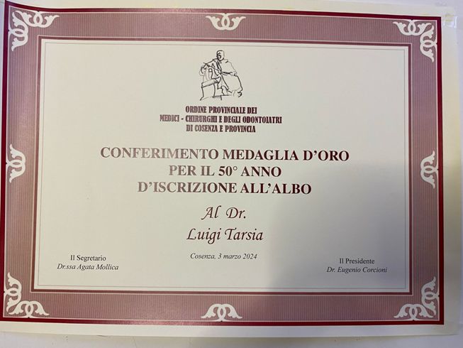In segno di stima e di riconoscenza verso le sue spiccate doti professionali e umane, nella giornata del 3 marzo scorso l’Ordine Provinciale dei Medici e degli Odontoiatri, per mano del suo Presidente Dr. Eugenio Corcioni (Segretaria la Dr.ssa Agata Mollica) gli ha conferito la Medaglia d’Oro per il suo 50° anno di iscrizione all’Albo Professionale. Laureatosi in Medicina e Chirurgia a Bologna nel 1973 e specializzatosi in Ortopedia e Traumatologia a Pisa, il Dr. Luigi Tarsia da giovane ha prestato servizio quale Assistente prima presso l’Istituto Ortopedico di Malcesine in provincia di Verona e poi presso il CTO “Rizzoli” di Bologna. E’ quindi sceso in Calabria operando come Aiuto presso il Reparto di Ortopedia del Ferrari di Castrovillari. Diventato Primario, il Dr. Luigi Tarsia ha quindi diretto i Reparti di Ortopedia degli Ospedali di Lungro e di San Marco Argentano e, prima di raggiungere la meritata quiescenza, ha retto per lunghi anni il Reparto di Ortopedia e Traumatologia di Castrovillari mantenendo allo stesso tempo il delicato ruolo di CTU del Tribunale di Castrovillari.