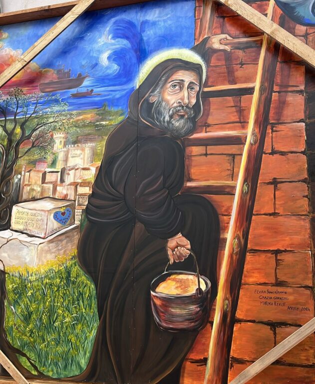 Da ricordare che in Vico Primo San Giacomo, sempre nelle zone limitrofe, dal 26 febbraio 2023 è presente un vero e proprio itinerario iconografico dedicato a San Francesco di Paola voluto sempre dall’ass. “Ri-Bellezza” e dove è già presente un’altra opera realizzata dalla stessa E. F. Iannini, raffigurante il miracolo dei “Tre Fichi” di S. Francesco. Questa volta, invece, sulla tela è ritratto il Santo Patrono in versione operaio che si accinge a salire una scala appoggiata ad un muro con in mano un secchio ripieno di una mistura di cemento. Immagine a voler ricordare anche l’edificazione della quarta casa fondata da San Francesco a Corigliano nel 1476. Dipinto realizzato con tempera acrilica con le misure due metri e cinquanta per due metri e cinquanta e dotato di cornice. Ciò che colpisce del Santo, oltre allo sguardo dolce e profondo allo stesso tempo, sono i grandi occhi fonte di saggezza, partecipazione e luminosità. Sullo sfondo non poteva mancare una pianta di ulivo, simbolo di Pace e tanto invocata dal Santo nelle sue epistole, il mare e le barche ispirate a Schiavonea che rappresentano la Fede attraverso cui superare le difficoltà della vita, il sole che sorge come la vita e il castello e il borgo antico di Corigliano, sempre caro al Santo come testimoniano anche i tanti scritti dell’epoca. L’erba con i fiori nella parte bassa e alle spalle del Santo anche dei mattoni disposti uno sull’altro e su uno in particolare campeggia una Sua massima “Amate questo luogo così come l’ho Amato Io” con di fianco il logo di “Ri-Bellezza”.