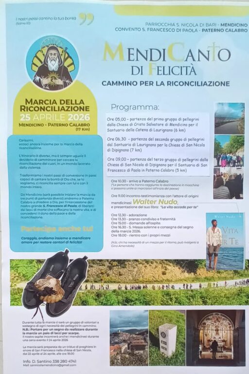 La “Marcia”, avrà una prima “tappa” presso il Santuario della Madonna della Catena di Laurignano e una seconda nella Chiesa di “San Nicola” di Bari a Dipignano. Alle ore 10:30 circa, dopo circa 18 chilometri, è previsto l’arrivo al santuario di San Francesco di Paola di Paterno Calabro. Luogo caro al Santo Patrono della Calabria che lo edificò e in cui dimorò per tanti anni. “Marcia della Riconciliazione” considerata una manifestazione religiosa e aggregativa che, nel tempo, ha avuto una crescita esponenziale tanto da divenire un incontro fisso per centinaia di persone. Al santuario, previste anche coinvolgenti attività e a corredo, alle 16:30, la Celebrazione Eucaristica.